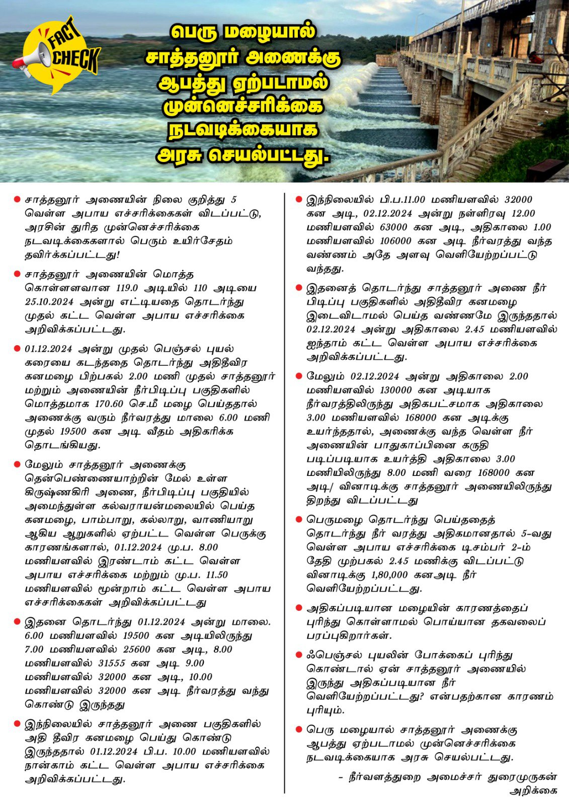 உள் மாவட்டங்களில் பெய்த அதி கனமழையால் சாத்தனூர் அணையிலிருந்து அறிவிக்கப்படாமல் தண்ணீர் திறந்துவிடப்பட்டுள்ளது என்று அஇஅதிமுக, பாமக உள்ளிட்ட எதிர்க்கட்சிகள் குற்றம்சாட்டியிருந்தன. நீர்வளத்துறை அமைச்சரும், அமைச்சகமும் தக்க ஆதாரங்களோடு இதனை மறுத்திருந்தன.
